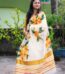 Handpainted Floral Cotton Saree – White with Yellow & Orange Flowers | With BP