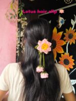 Bring elegance to your hairstyle with this hand-crocheted lotus hair clip. Featuring a beautifully detailed pink bloom with a pearl-accented center and two dangling lotus buds, this artisanal barrette is perfect for adding a graceful, nature-inspired touch to any look.