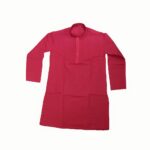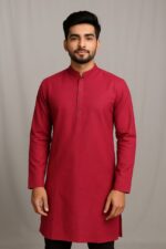 Elegant red cotton men’s Punjabi/Kurta in breathable fabric. Available in sizes 38, 40, and 42. Perfect for puja, weddings, and festive occasions.